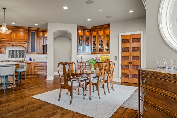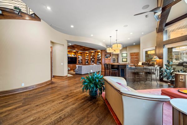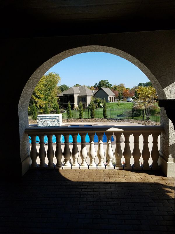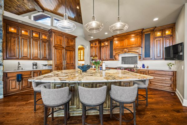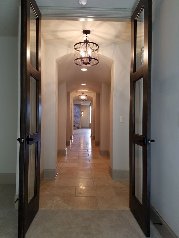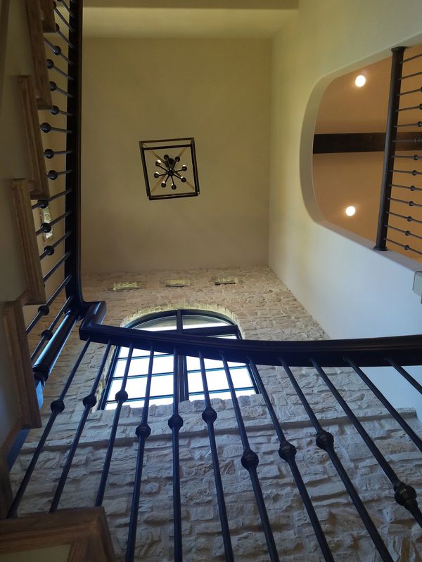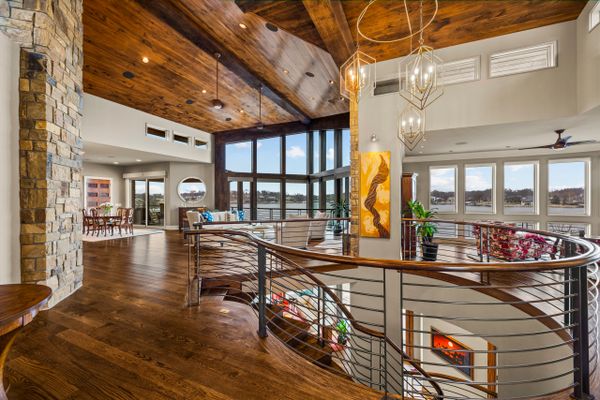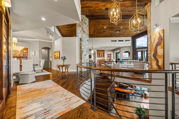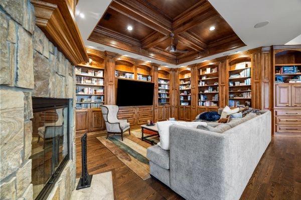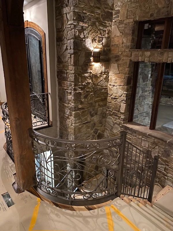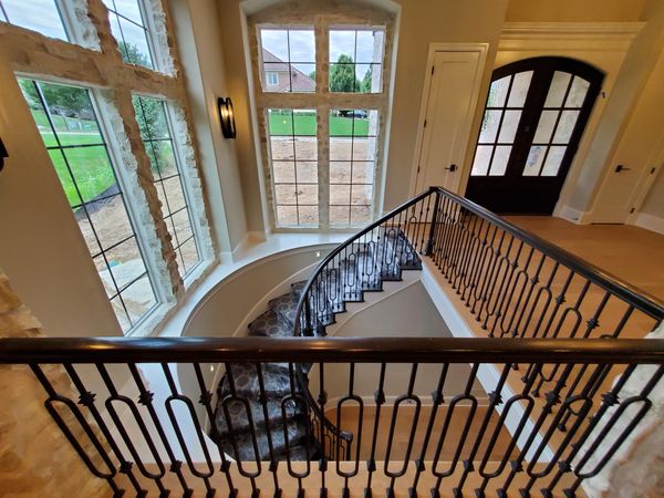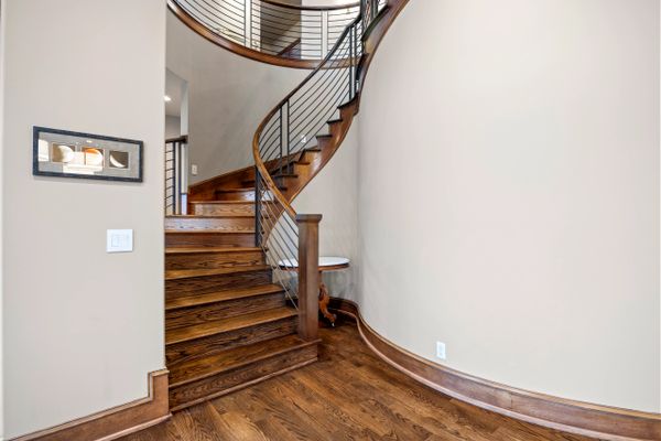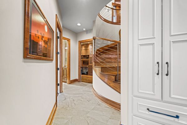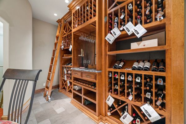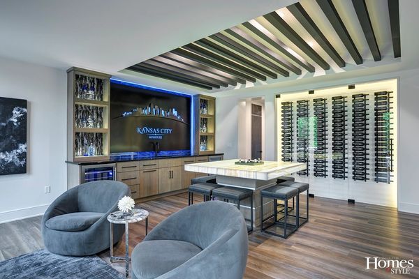 The vast, circular-shelved walls are brimming with intriguing details, nods to tradition and other features of fancy, such as souvenirs from the couple’s annual trips overseas, KC heritage pieces and mementos from Chris’ military service. Upstairs, a custom-made roundabout metal catwalk separates the library floors, enhancing the “European castle” effect with its medieval intricacies and letter “C” engravings (short for “Connell”) on the support brackets. The main floor even features callbacks to local history within the faux fireplace. The bricks, now over 100 years old, were taken from the original Holy Family Catholic Church walkway in Eudora, Kansas. The keystone, meanwhile, comes from the 1860s-built farm home that originally sat on the Connells’ current property.