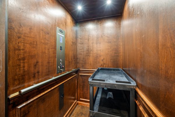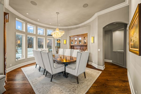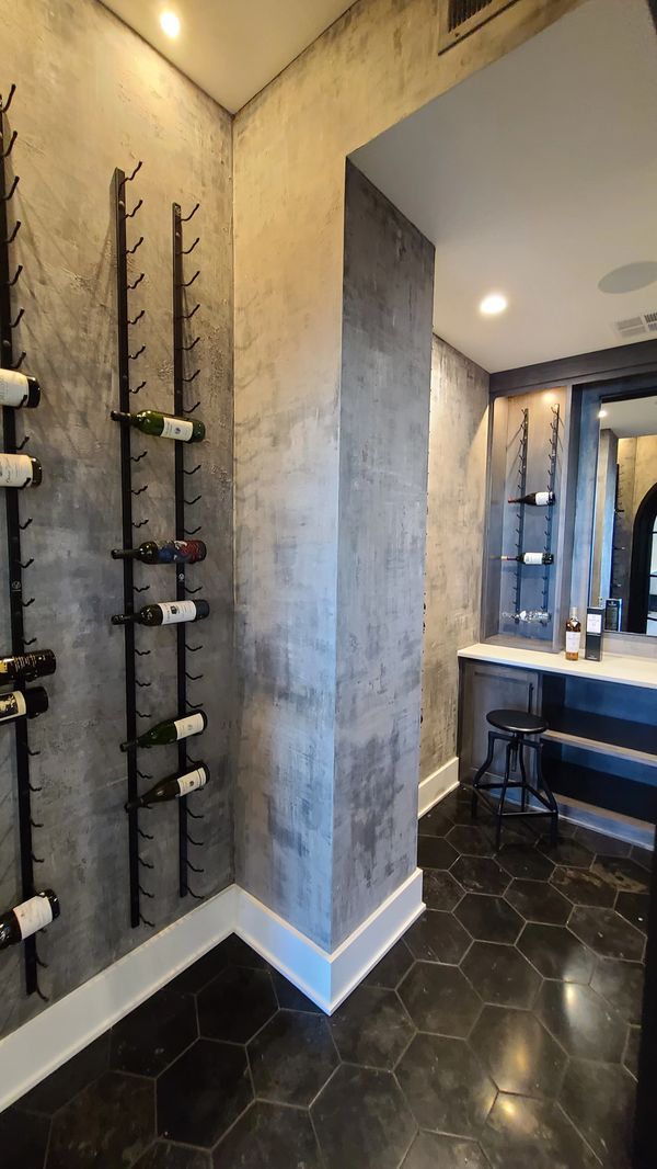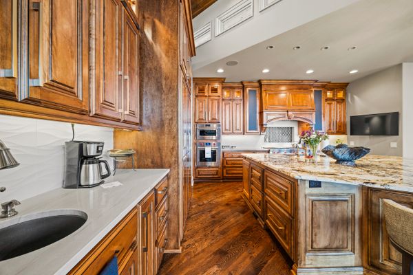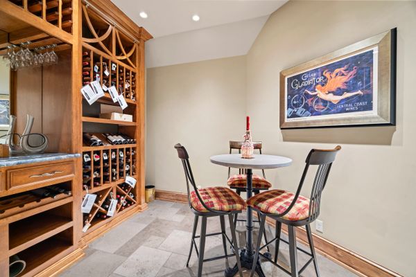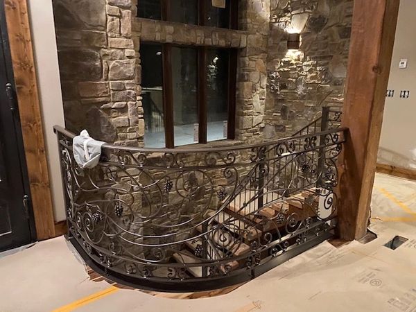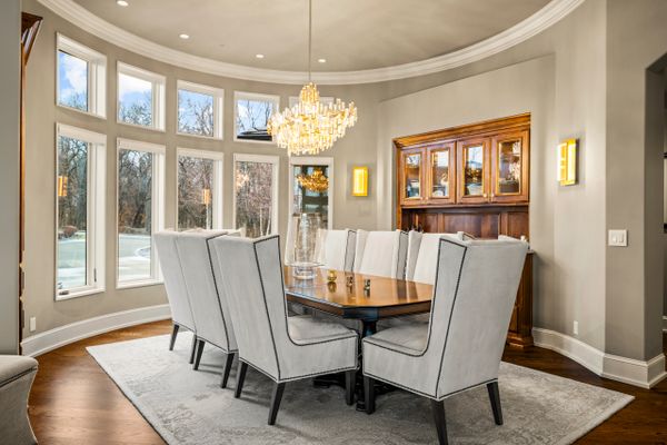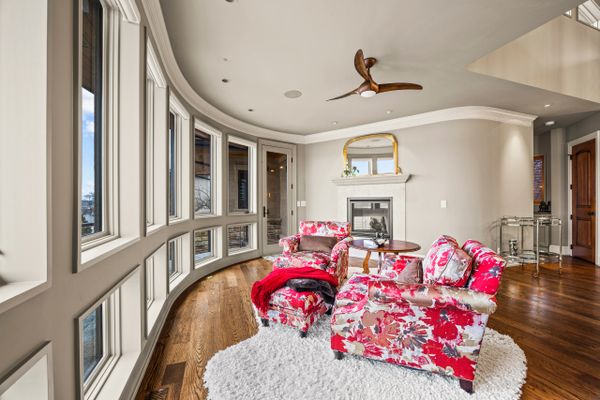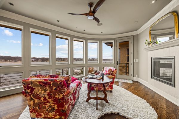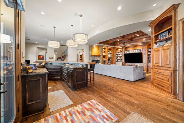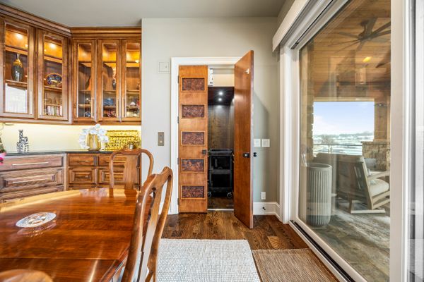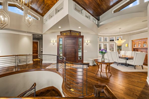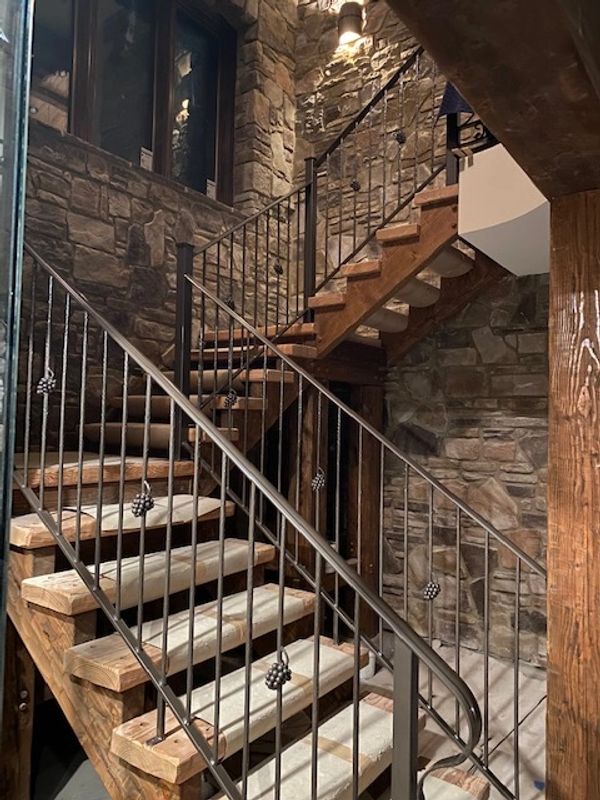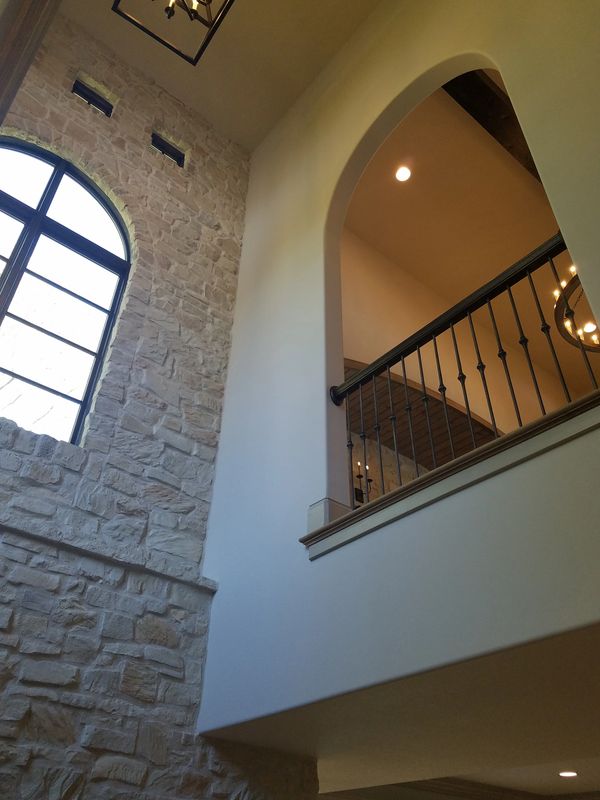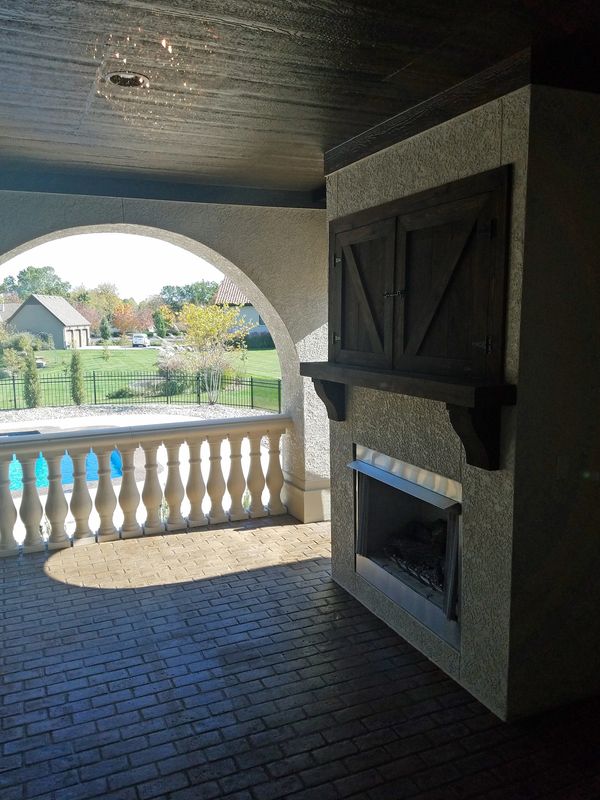 The vast, circular-shelved walls are brimming with intriguing details, nods to tradition and other features of fancy, such as souvenirs from the couple’s annual trips overseas, KC heritage pieces and mementos from Chris’ military service. Upstairs, a custom-made roundabout metal catwalk separates the library floors, enhancing the “European castle” effect with its medieval intricacies and letter “C” engravings (short for “Connell”) on the support brackets. The main floor even features callbacks to local history within the faux fireplace. The bricks, now over 100 years old, were taken from the original Holy Family Catholic Church walkway in Eudora, Kansas. The keystone, meanwhile, comes from the 1860s-built farm home that originally sat on the Connells’ current property.