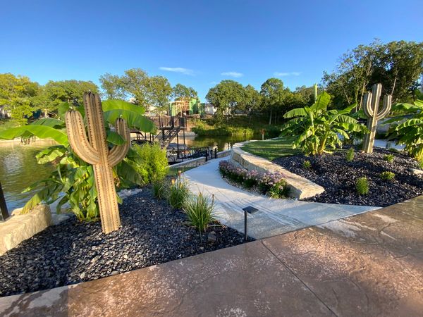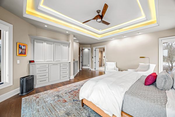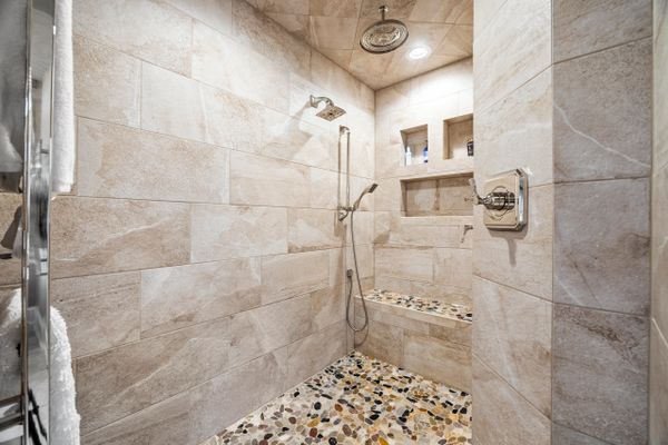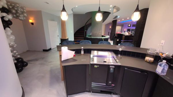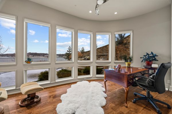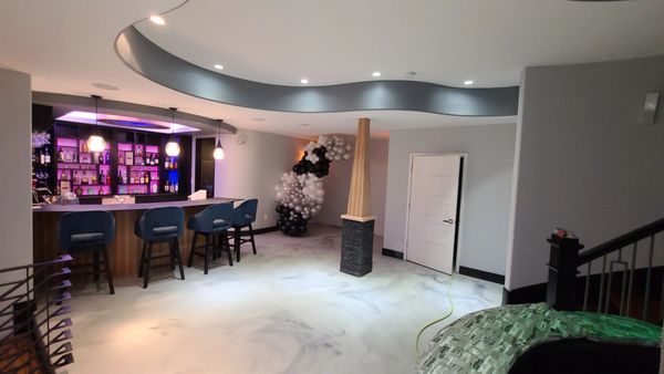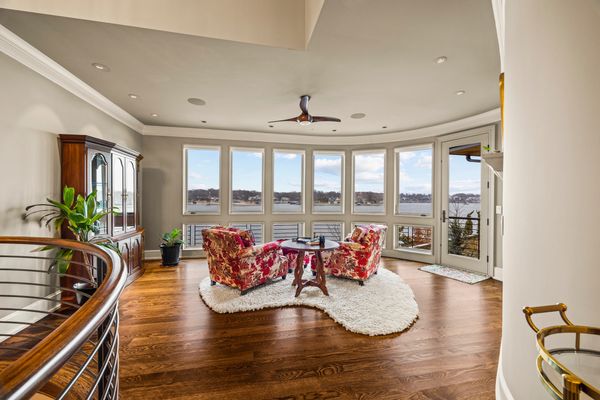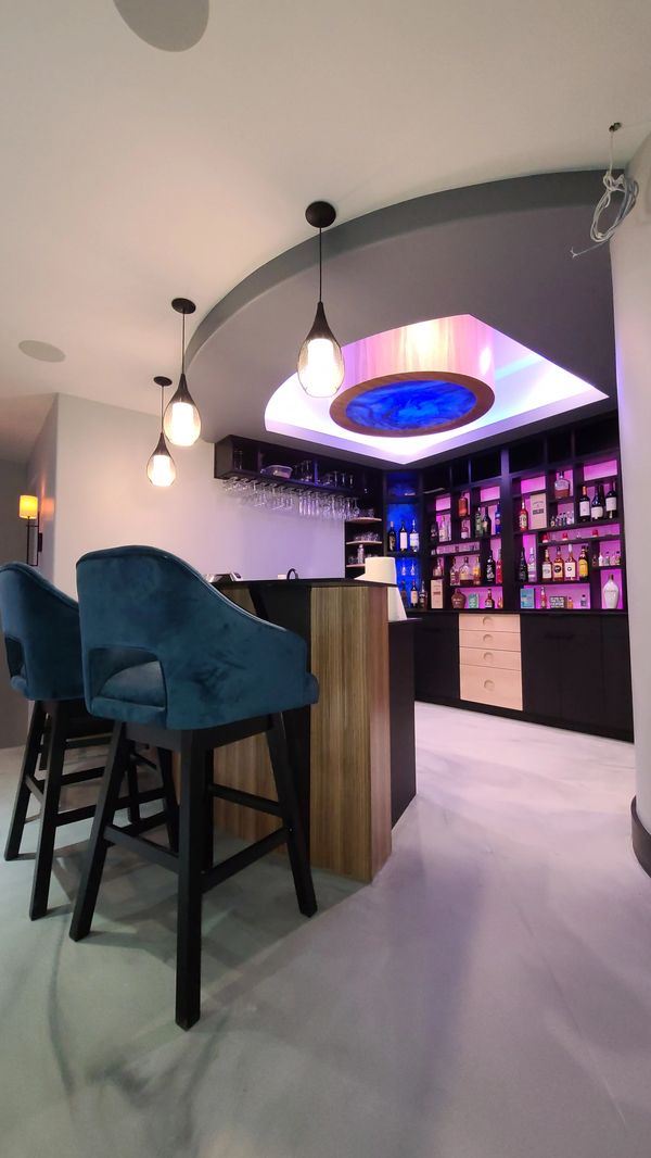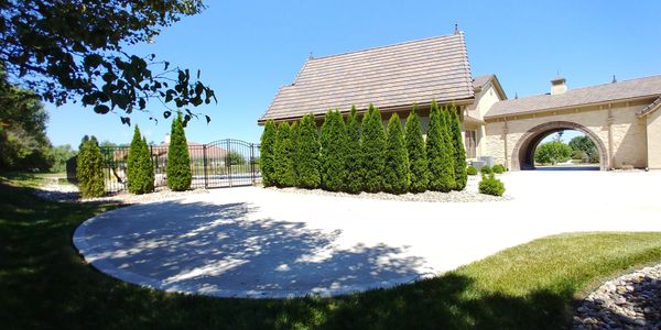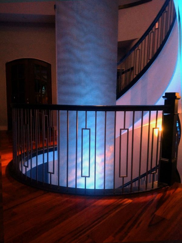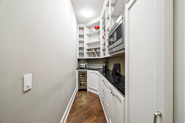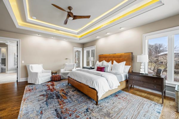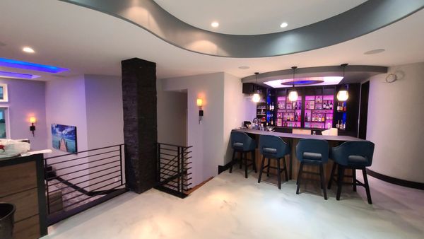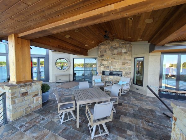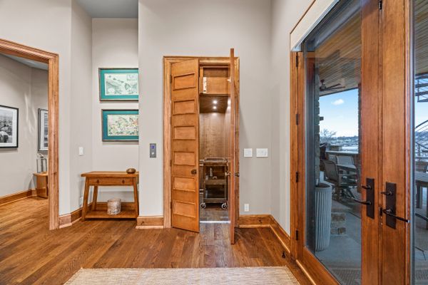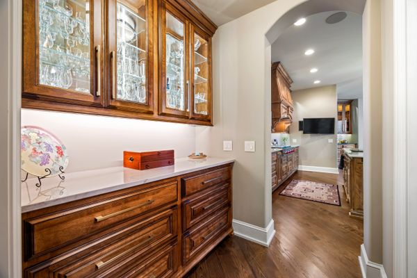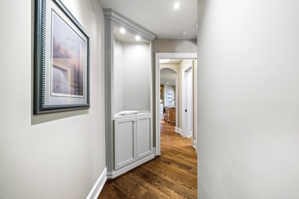 The vast, circular-shelved walls are brimming with intriguing details, nods to tradition and other features of fancy, such as souvenirs from the couple’s annual trips overseas, KC heritage pieces and mementos from Chris’ military service. Upstairs, a custom-made roundabout metal catwalk separates the library floors, enhancing the “European castle” effect with its medieval intricacies and letter “C” engravings (short for “Connell”) on the support brackets. The main floor even features callbacks to local history within the faux fireplace. The bricks, now over 100 years old, were taken from the original Holy Family Catholic Church walkway in Eudora, Kansas. The keystone, meanwhile, comes from the 1860s-built farm home that originally sat on the Connells’ current property.